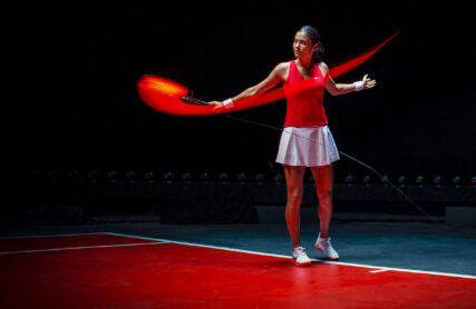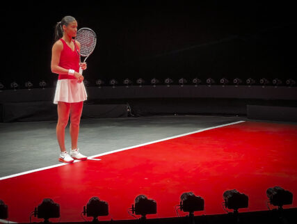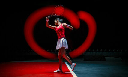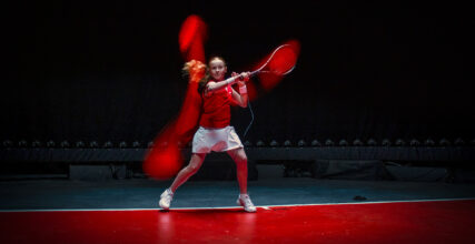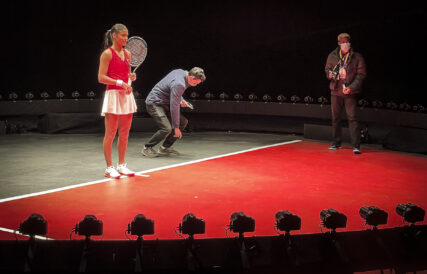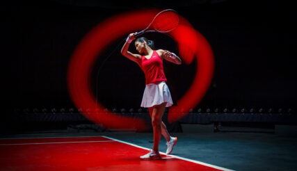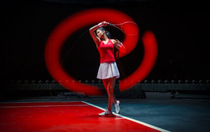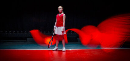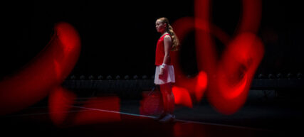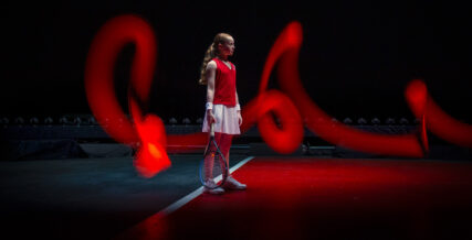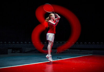 The movies were all shot in-camera, with no CGI. Using a 4 second exposure and a rear curtain flash to freeze Emma. Nathan created an illuminated tennis racket, which showed the light trail path as it moved.