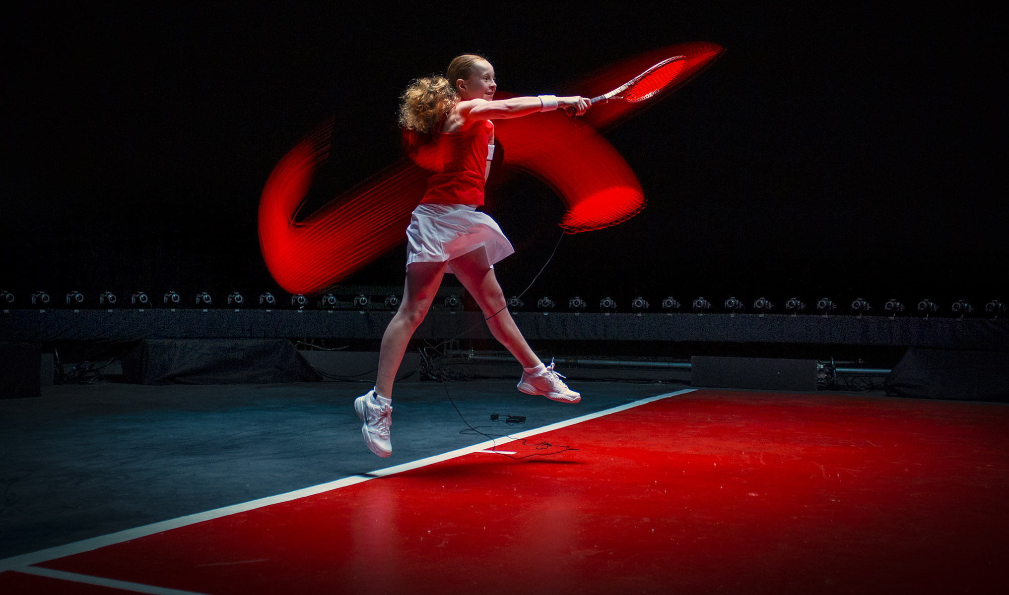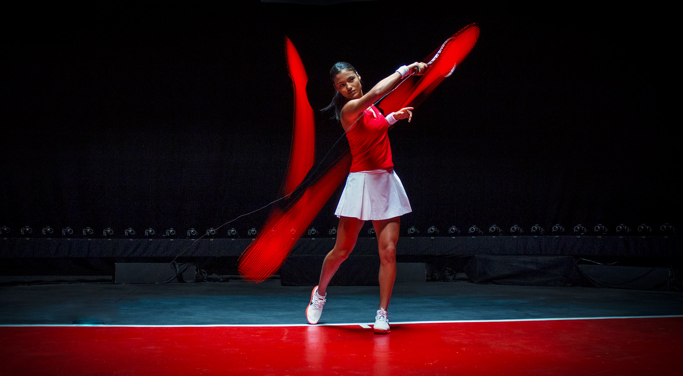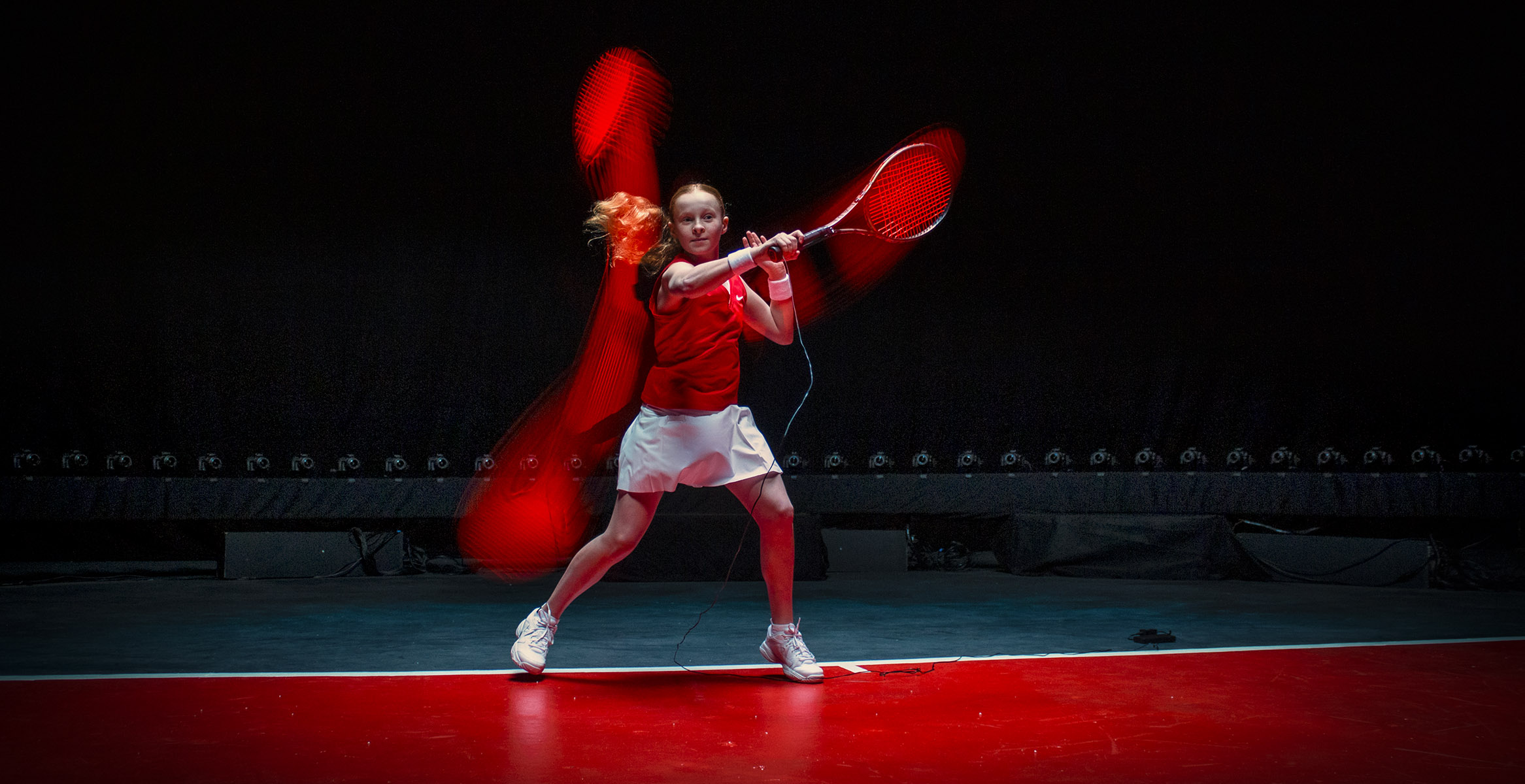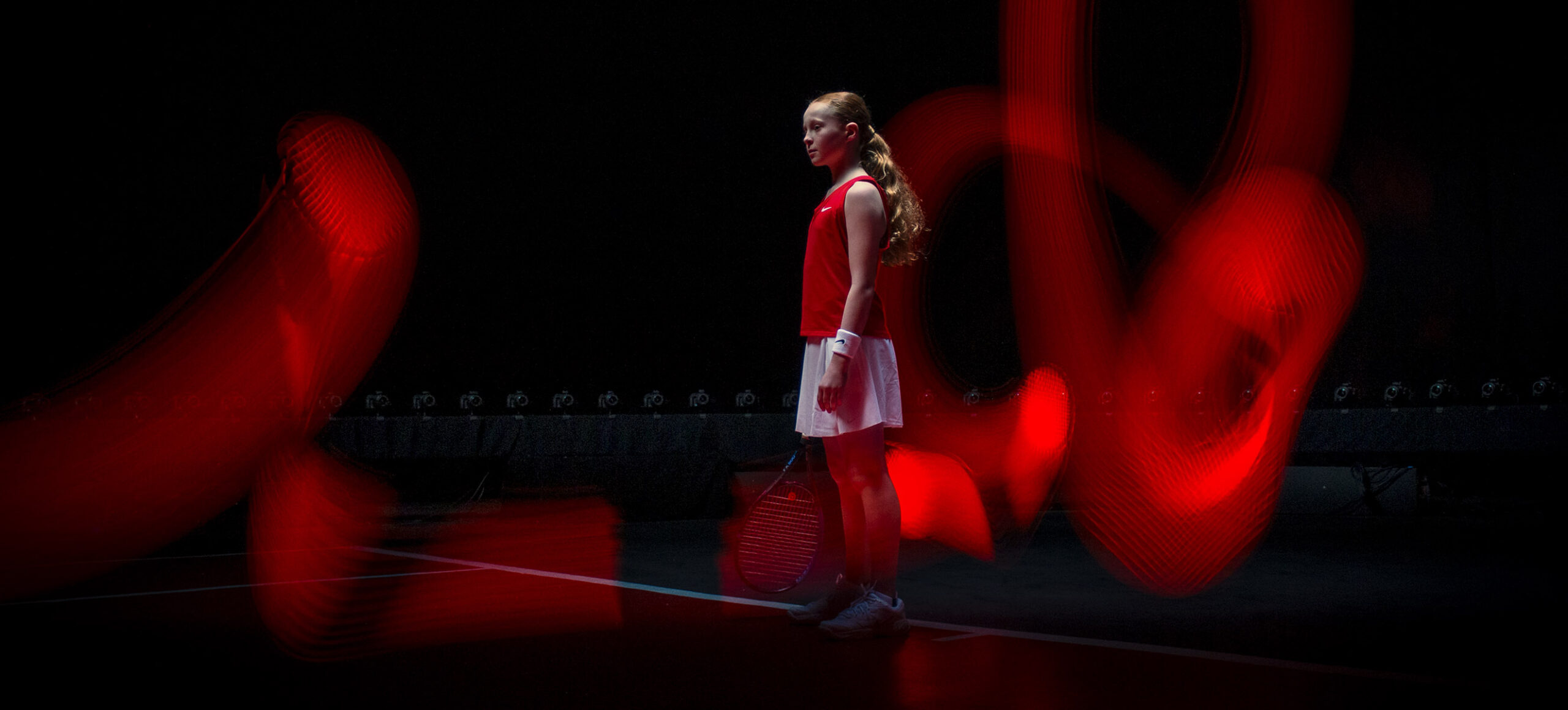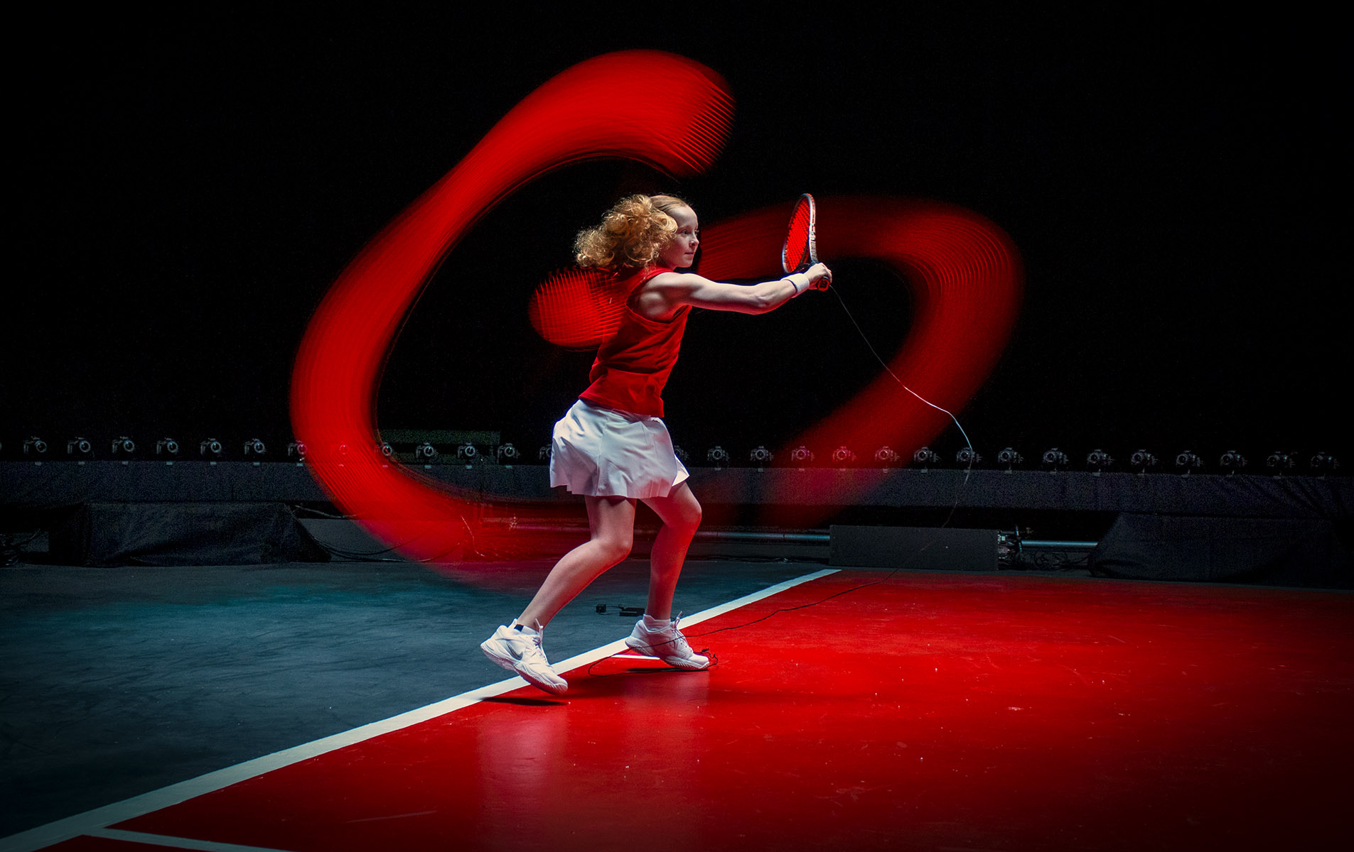 The movies were all shot in-camera, with no CGI. Using a 4 second exposure and a rear curtain flash to freeze Emma. Nathan created an illuminated tennis racket, which showed the light trail path as it moved.