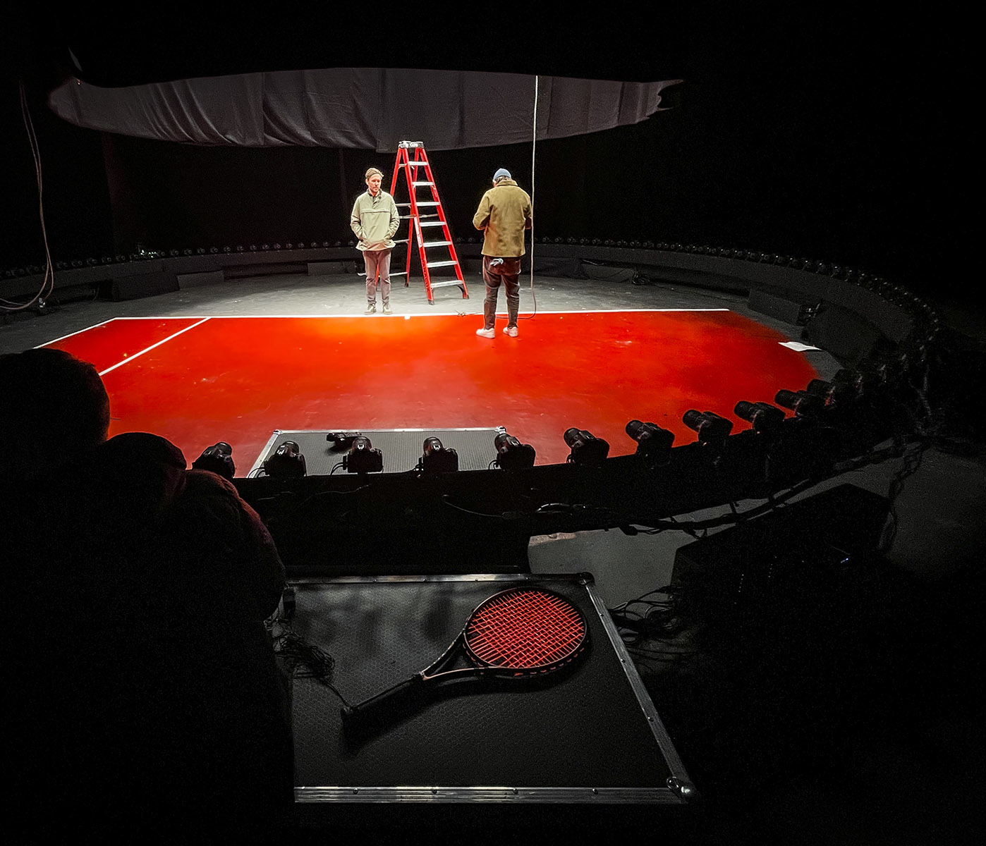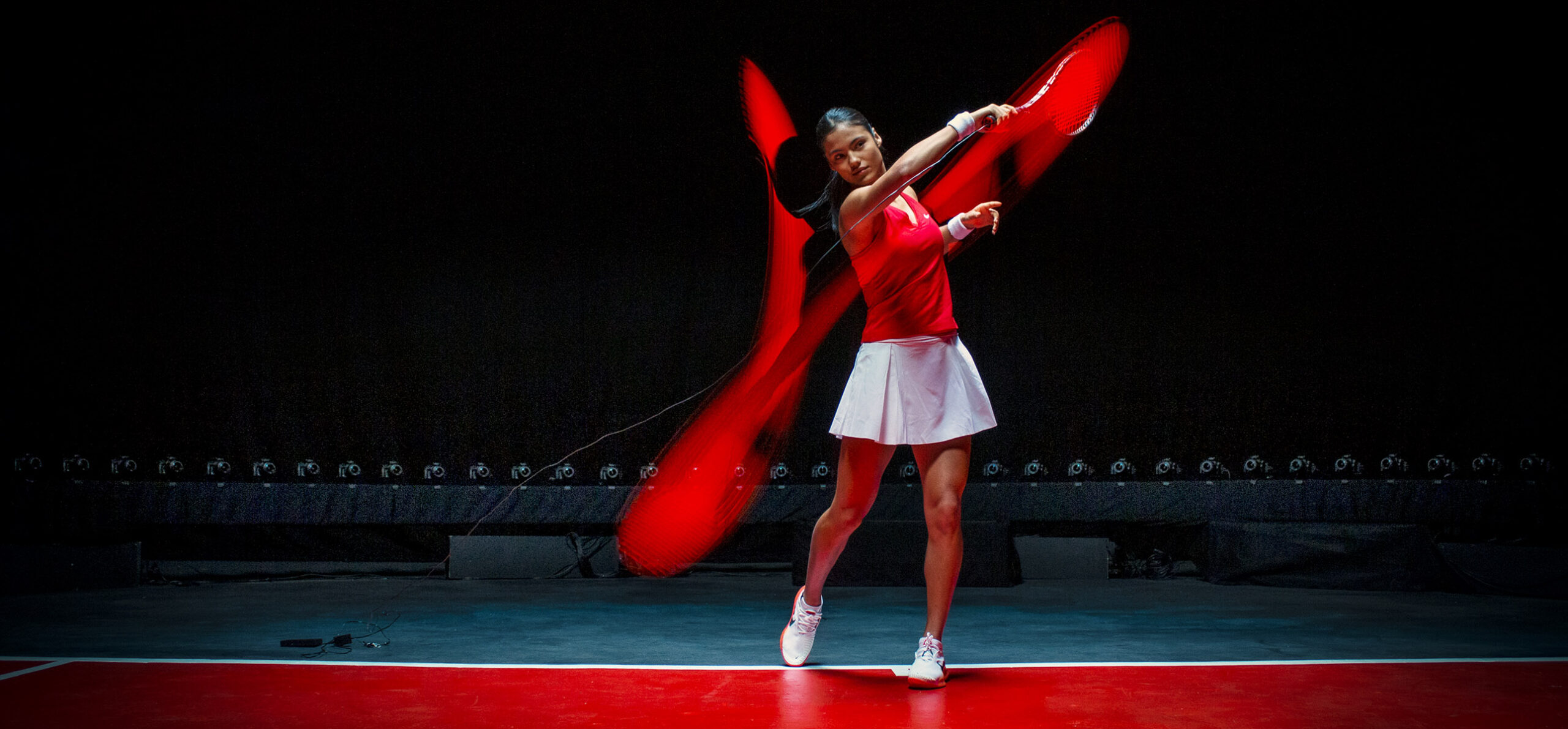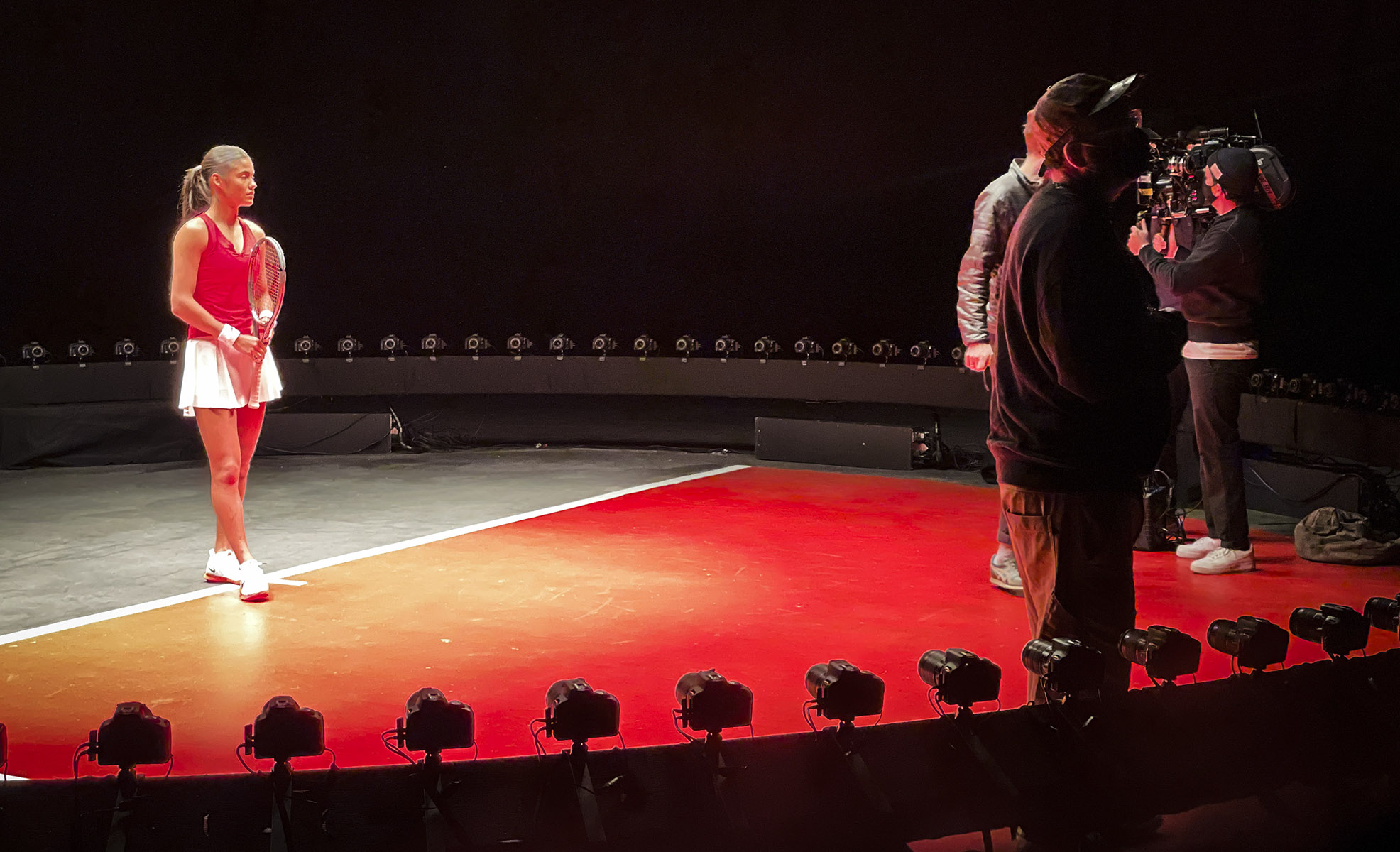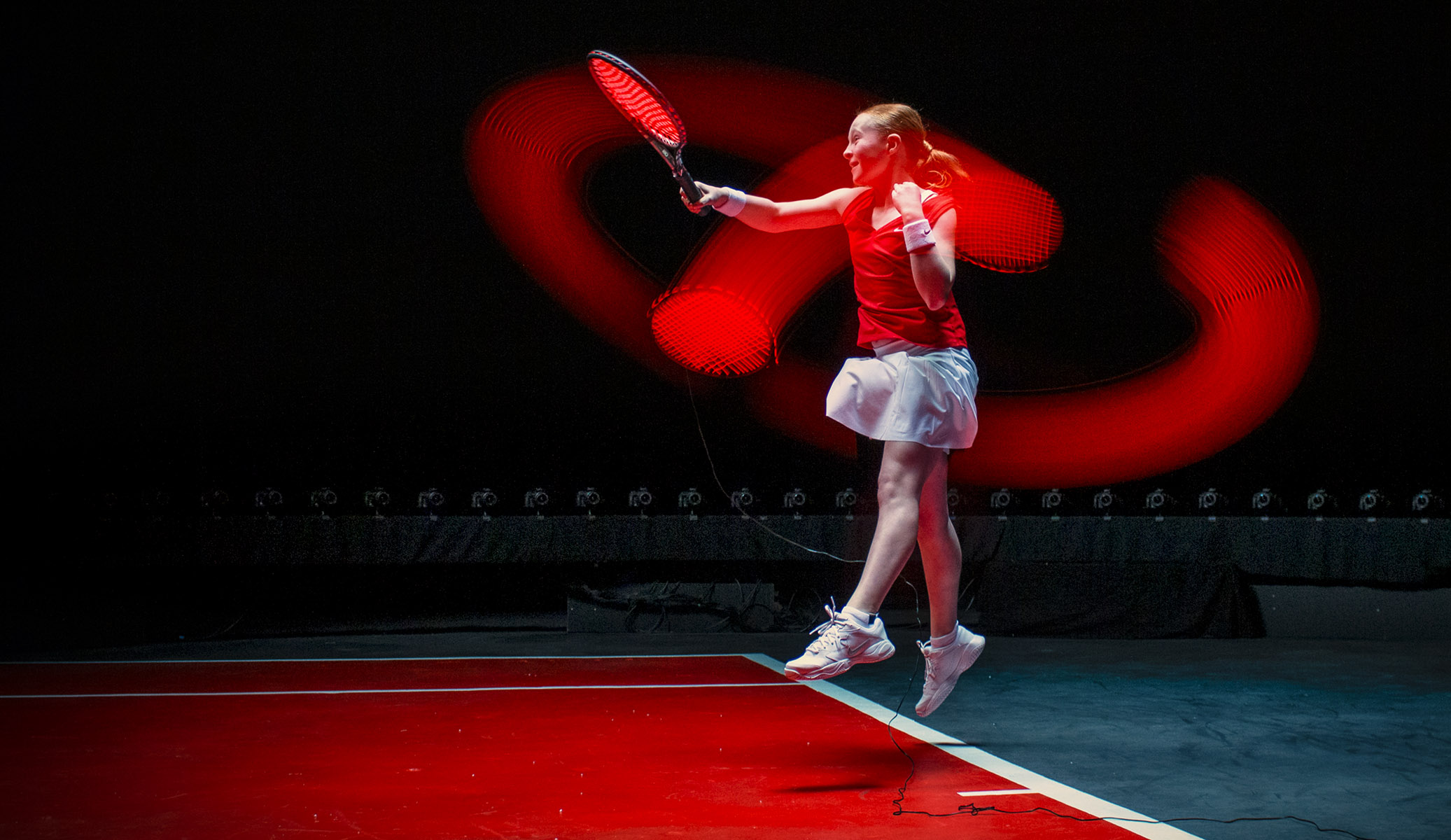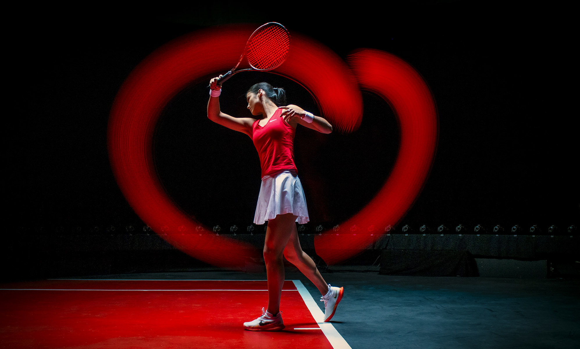 The movies were all shot in-camera, with no CGI. Using a 4 second exposure and a rear curtain flash to freeze Emma. Nathan created an illuminated tennis racket, which showed the light trail path as it moved.