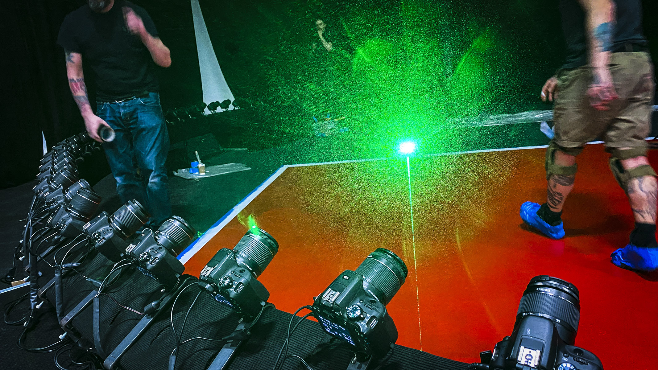 The process we used captured the motion using Bullet Time Light Painting, with all the cameras set to long exposure of 4 seconds and a curtain flash to freeze the subject.
