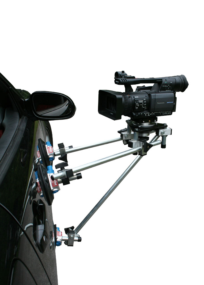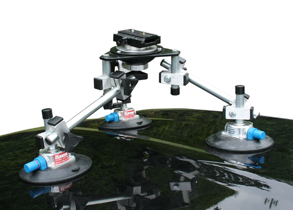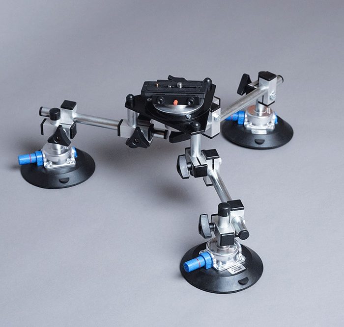 The Hague SM3 Pro Suction Mount is designed for secure camera mounting on cars or any flat, non-porous surface. Equipped with three suction pads, it can be easily attached to both horizontal and vertical surfaces. Each suction pad and the triangular plate feature adjustable brackets, and the mount comes with a variety of connecting poles in different lengths, allowing for flexible positioning.